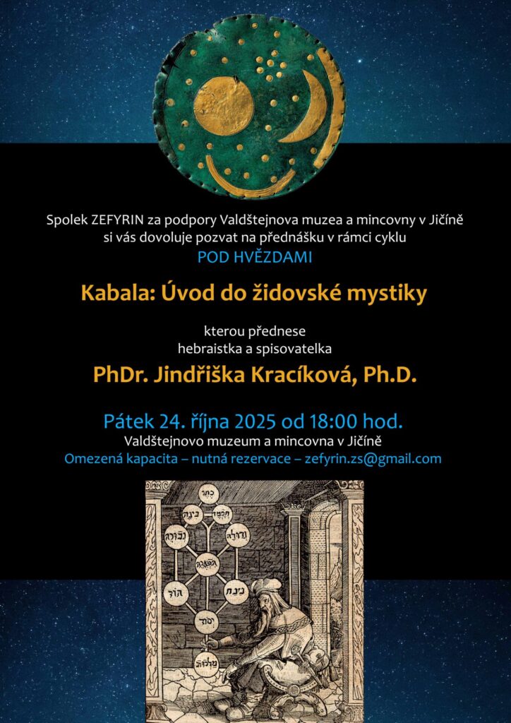 Pokud máte pocit (i během pročítání této pozvánky), že je pro vás téma kabaly nesrozumitelné, příliš složité a že vám obsah této nauky uniká, přitom by vás ale židovská mystika vlastně zajímala, pak právě vám je určena přednáška „Kabala: Úvod do židovské mystiky“, pořádaná v rámci stále populárnějšího cyklu „Pod hvězdami“. Hebraistka PhDr. Jindřiška Kracíková, Ph.D. nám v pátek 17. října 2025 srozumitelnou a poutavou formou představí historický vývoj a základní náplň této mystické nauky. Vysvětlena bude i pozoruhodná myšlenka kosmického stromu (ilán) s jeho sefirami nebo převtělování duší (gilgul), které sice není tradičnímu judaismu vlastní, přesto je akceptováno a kabala této možnosti plně využila. Opomenuta nebude ani tradice golemů – člověkem uměle vytvořených bytostí, oživených tajným Božím jménem.