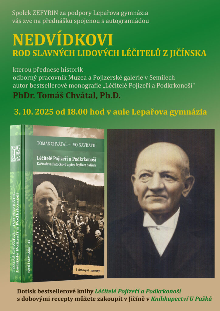 Jeho přednáška „Nedvídkovi: rod slavných lidových léčitelů z Jičínska“, kterou jsme pro vás připravili na pátek 3. října 2025, bude současně slavnostním jičínským uvedením jeho nové knihy, která se v posledních měsících stala doslova bestsellerem. Téměř šestisetstránková kniha „Léčitelé Pojizeří a Podkrkonoší: Květoslava Patočková a přes čtyřicet dalších“, vydaná v několikatisícovém nákladu, byla ani ne po čtvrt roce rozebrána a pro pokračující velký zájem musel být realizován dotisk.