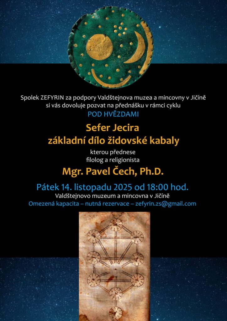 Jedinečná přednáška nazvaná „Sefer Jecira – základní dílo židovské kabaly“ proběhne v pátek 14. listopadu 2025 od 18.00 hod. v prostorách Valdštejnské obrazárny Valdštejnova muzea a mincovny. Kapacita přednáškové místnosti je ale omezena počtem 35 míst, proto případné zájemce prosíme, aby si včas rezervovali místo e-mailem na zefyrin.zs@gmail.com